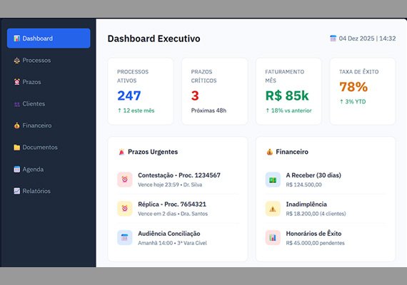 Gestão de processos, controle de prazos, cálculos automatizados, geração de documentos e relatórios.